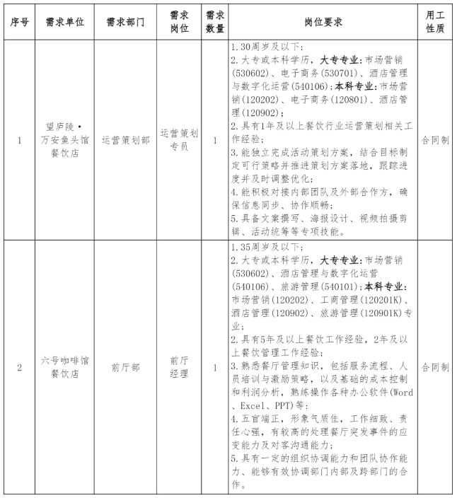 吉安市庐陵工程咨询集团有限公司是经吉安市人民政府授权,吉安市城市建设投资开发有限公司注资,于2014年3月成立的国有独资公司,注册资金2亿元。吉安市后河文化娱乐有限公司为吉安市庐陵工程咨询集团有限公司全资子公司,目前主要以运营望庐陵·万安鱼头馆、六号咖啡馆为主。其中,望庐陵·万安鱼头馆是吉安首家沉浸式“盛唐文化”、以万安鱼头为主、庐陵菜为辅的“盛唐文化”体验餐厅,是为了传承庐陵文化基因,促进“庐陵佳宴·唐风绮筵”这一“文+食+旅”高度融合的唐文化概念餐饮体验项目。吉安市六号咖啡馆是一家以赣菜为主、粤菜为辅,附以咖啡饮品的复合型餐厅,位于庐陵文化城6号楼。目前正装修升级中,未来将打造为适宜朋友聚会的轻奢风格餐厅,可承接小型团建、会议用餐、户外聚会等。根据工作需要,经集团研究,决定面向社会公开招聘2名工作人员,具体招聘公告如下: