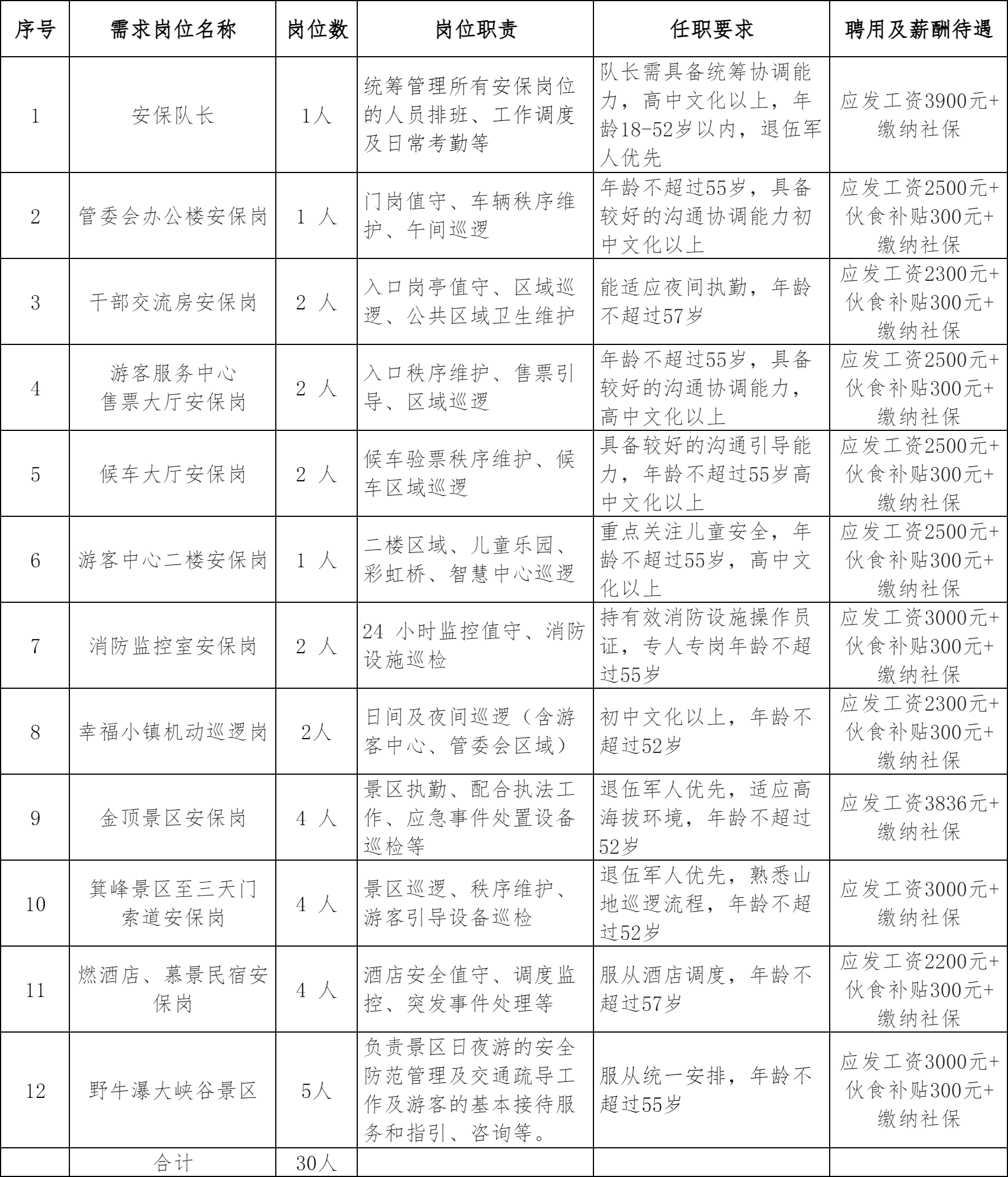 因工作需要,江西新鸿人力资源服务有限公司受吉安武功山景区开发建设部委托,现面向社会公开招聘保安工作人员30名,现将有关事项公告如下: