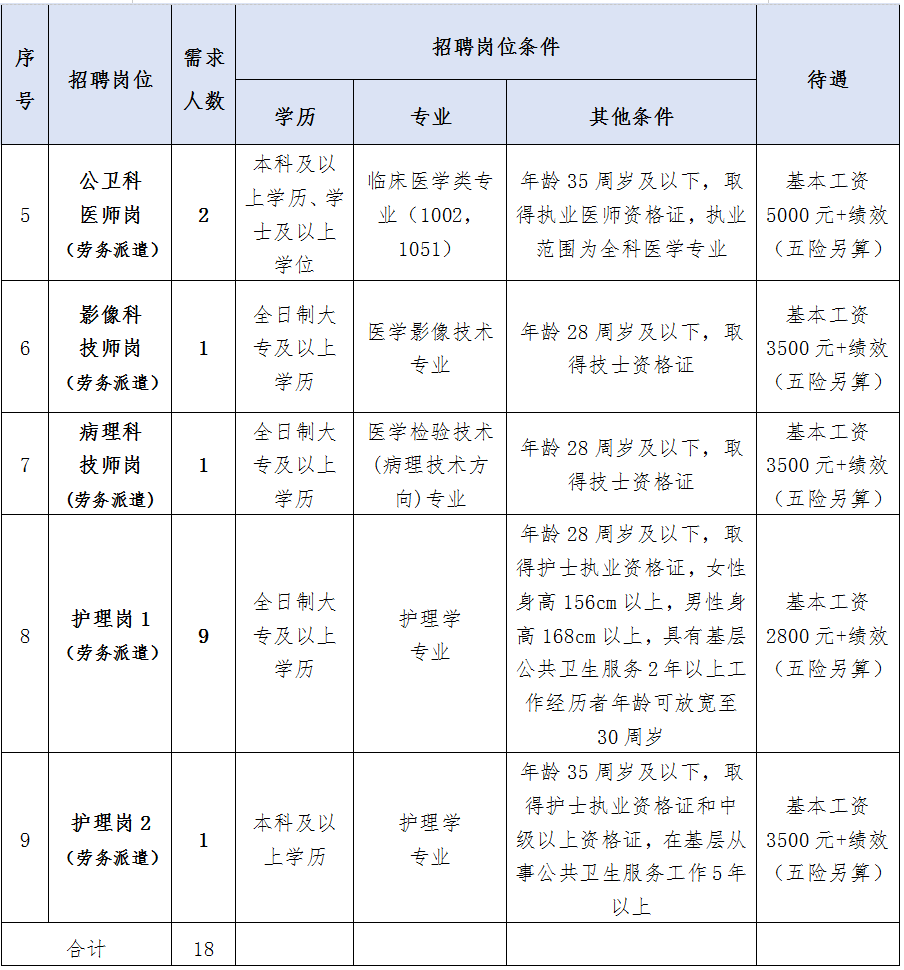 劳务派遣制人员:基本工资2800-5000元/月(具体标准详见《招聘岗位表》),绩效工资参照医院绩效考核方案执行;享受工作餐补贴,缴纳社会保险。